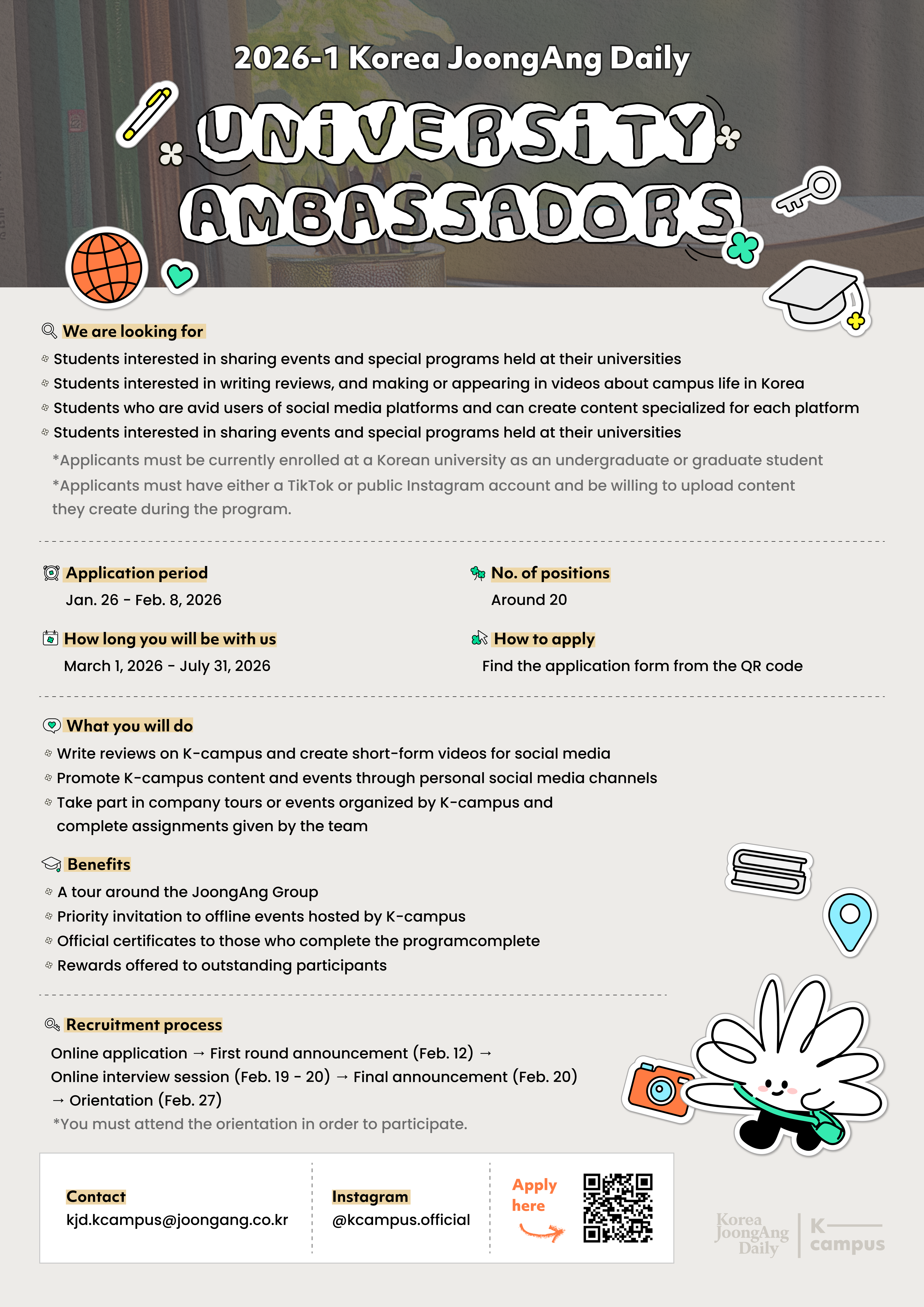cia2026-01-29T15:28:41+09:00Korea JoongAng Daily is recruiting University Ambassadors to join us through July 2026. If you’re a fan of K-campus and enjoy creating content about your campus life in Korea, this is your chance to showcase your talent! ️ Application period: Jan. 26 - Feb. 8, 2026 Number of positions: Around 20 students Program duration: March 1, 2025 - July 31, 2026 What you will do - Write reviews for K-campus on the Real Life Reviews section - Create social media content about campus life in Korea - Promote K-campus content and events through your personal social media channels - Take part [...]